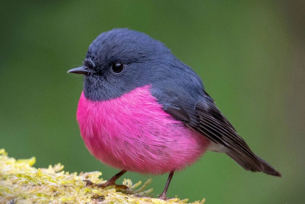 北米で一般的に見られるロビン(コマツグミ)は、赤茶色の胸の上にくすんだ羽毛をまとっていますが、ビクトリア州、ニューサウスウェールズ州、タスマニア州にのみ生息する、よりエキゾチックなロビン(コマドリの仲間)には、胸が鮮やかなピンク色をした種類がいます。この蛍光ペンのように強烈なピンクは、つややかな黒い頭部や尾、背中の羽毛と鮮やかなコントラストを成しています。さらに、ふっくらとした体つきも、とても愛らしい印象を与えます。