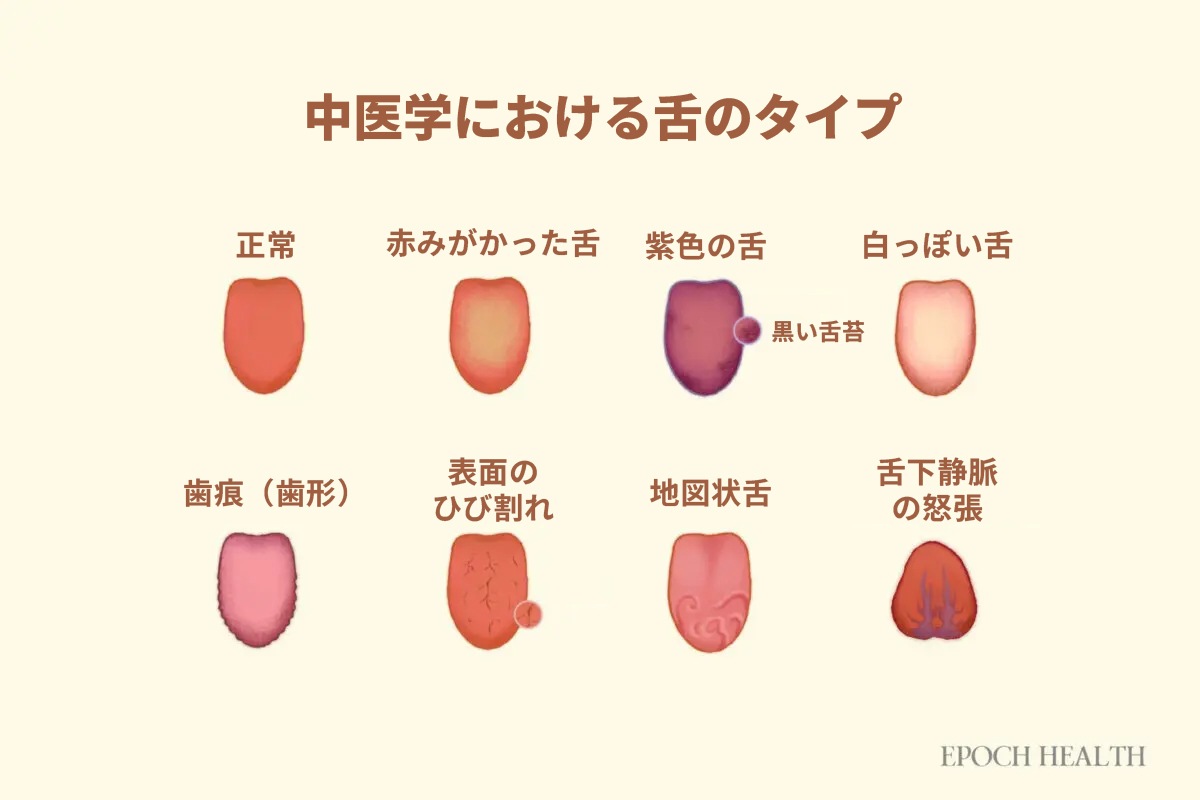 日本の中医学師・甄立学氏はエポックタイムズに対し、健康な舌苔は薄く均一な白色で、適度な湿り気がある状態だと語っています。一方で、注意が必要な舌苔の変化には、次のようなものがあります。