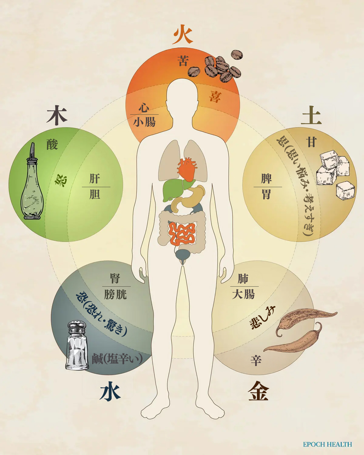 さらに、肺の土台となるのが脾です。脾は「土」に属し、土は金を生みます。脾が元気であれば肺の働きが充実し、肺が充実すれば腎の水が養われ、腎の水が満ちてこそ骨髄が生まれ、骨は強くなります。