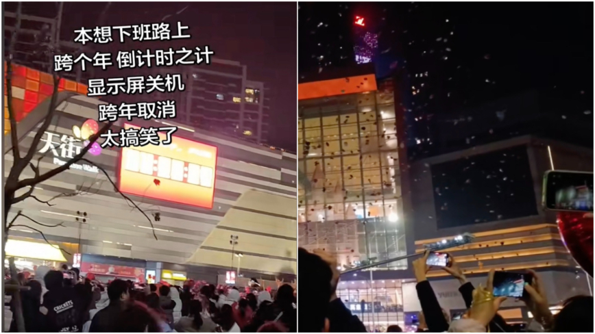 (2025年12月31日、中国各地で年越しイベントが中止され、人々が集まる中で大型スクリーンが消灯した)