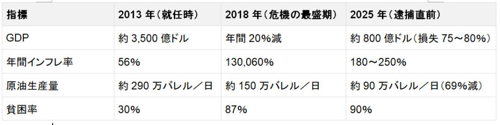 マドゥロ政権下での13年間に、ベネズエラ経済は崩壊し、国内総生産(GDP)はおよそ75〜80%減少した。これは近代史上、戦時を除けば最も深刻な経済収縮である。