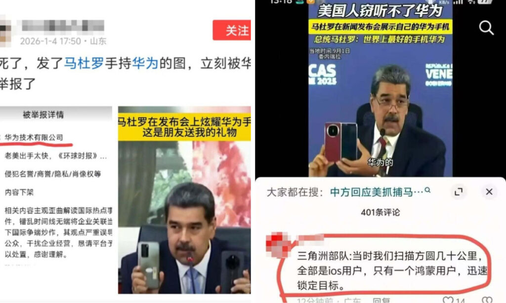 右図:マドゥロ氏が記者会見でファーウェイ製スマートフォンを掲げ、「世界で最も優れた携帯電話だ」と語る場面。画面下には、「米軍が周囲数十キロをスキャンしたら全員iPhoneで、ファーウェイ利用者が1人だけいて即座に特定できた」とするブラックジョークなど、中国ネット上の皮肉コメントが並ぶ。(スクリーンショット)