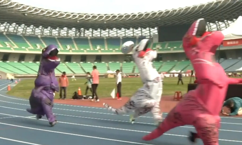 恐竜の着ぐるみを着た大人たちが、全力で走っている。しかも、スタートの合図はまだだ。待ちきれずに走り出す恐竜までいた。その姿を見た周囲から笑いが広がった。