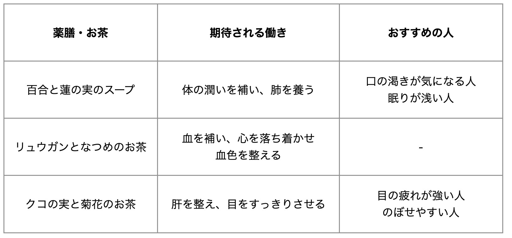 まず大切なのは、夜更かしを続けないことです。どうしても夜更かしが避けられない場合には、次の4つのリカバリー対策を取り入れることで、体への負担を軽減することができます。第一に、翌日の昼に30分ほど仮眠を取ること。第二に、味の濃いものや刺激の強い食事(辛いもの、揚げ物など)を避け、肝臓への負担を減らすこと。第三に、以下のような体を温め、疲労を和らげる薬膳やお茶を取り入れること。