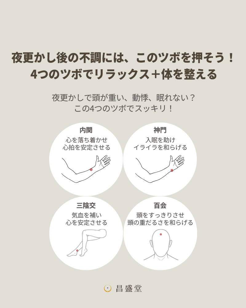 ワンポイントアドバイス:夜更かしは、どうしても避けられない場合もありますが、できるだけ頻度を減らすことが大切です。また、日頃からセルフケアを意識することも重要で、バランスの良い食事、規則正しい生活、そしてツボ押しなどを取り入れることで、体質を整え、体の機能や心身の活力を保つことにつながります。