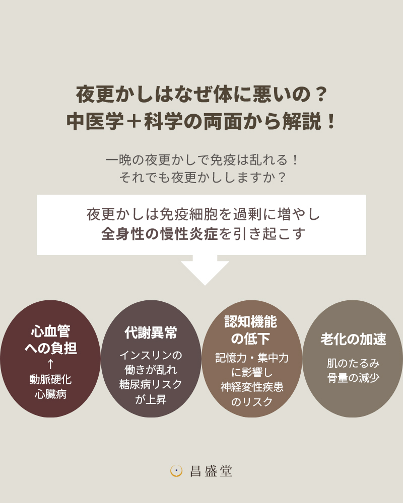 中医学では、夜11時から午前3時は「肝・胆」の経絡が巡る時間帯であり、体が解毒や修復を行う非常に重要な時間と考えられています。この時間帯に深い眠りに入れていないと、肝や胆の気血の巡りが乱れ、気血の生成や代謝に影響を及ぼします。その状態が長く続くことで、心・脾・肺・腎といった他の臓腑の働きにも悪影響が及び、全身の陰陽バランスが崩れてしまいます。