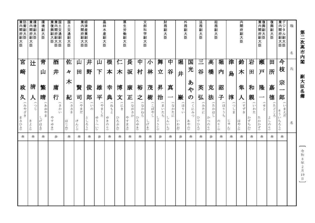 令和8年2月18日に発足した第2次高市内閣における、同年2月19日付の副大臣名簿は以下の通り発表された。