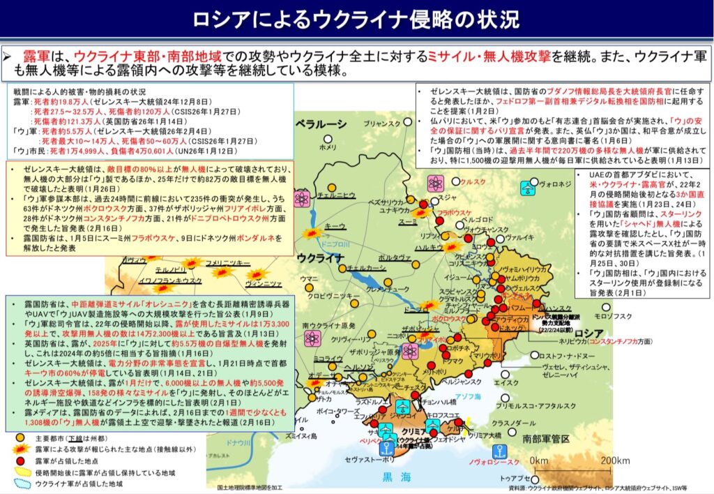 防衛省・自衛隊は16日、Xにおいてウクライナ情勢に関する最新の動向を報告した。公表された資料は、戦闘が長期化する中で無人機(ドローン)への依存が極限まで高まっている戦況や、双方の膨大な人的被害、そして水面下で進む外交交渉の動きを浮き彫りにしている。本稿では、防衛省の公表資料に基づき、2026年2月16日時点のウクライナ情勢を概観し、今後の展望を分析する。
