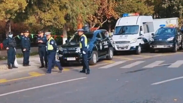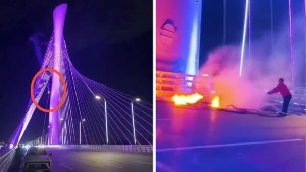 交通警察に電動バイクを取り上げられた男性が道路の真ん中に横たわった。
