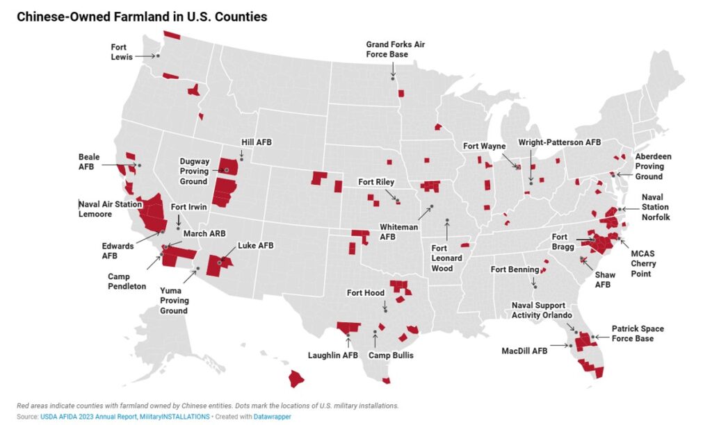 中国によるアメリカ農地への投資は全国に分散しており、特にテキサス州、ノースカロライナ州、ミズーリ州、ユタ州、フロリダ州に集中している。