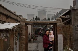 北京郊外の古い街で赤ん坊を抱く女性、石炭コークス炉が遠くに見える。11月27日撮影。中国政府は2030年までの早い時期に、二酸化炭素(CO2)排出量をピークにさせ、以後は減少させるとしている。11月30日~12月11日、フランスのパリで国連気候変動会議(COP21)が開催され、地球温暖化防止の策として、参加国はCO2排出量枠を主要議題にする予定。