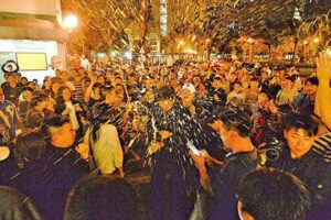 11月28日米国が感謝祭を祝うなか、香港では数万人もの人々が中心広場に集まり、米国旗や米国国歌を歌った。
