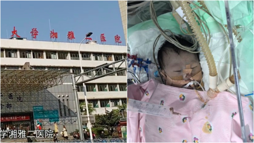 湖南省の湘雅二病院で新生児が2度の開胸手術後に死亡した。遺族は医療ミスを疑い、病院側は死亡原因も監視映像も示していないという。ECMOや呼吸器の取り外しも同意なしとされ、危篤時も父親は面会できなかった