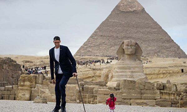 世界一身長が高い男性と世界一身長が低い女性 ピラミッド前で写真を撮る