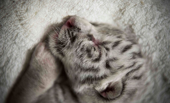 『写真で一言』眠っている生まれたばかりのホワイトタイガー