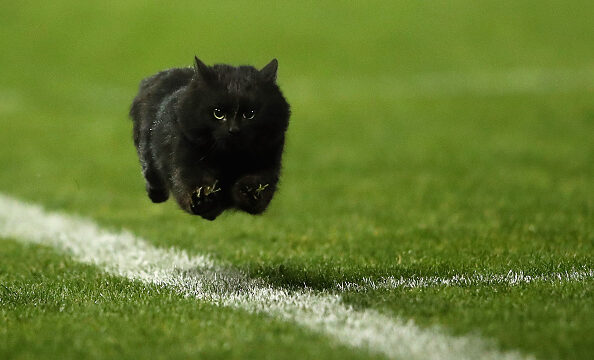 『写真で一言』ラグビーの試合中に疾走する黒ねこ
