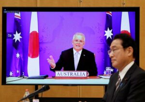 [東京 6日 ロイター] - 岸田文雄首相とオーストラリアのモリソン首相は6日、テレビ会議形式で首脳会談を行い、2007年に策定した安全保障協力に関する共同宣言を上書きする新たな宣言を早期に発出することで一致した。円滑化協定に署名し、両国部隊の共同訓練などを円滑化する。