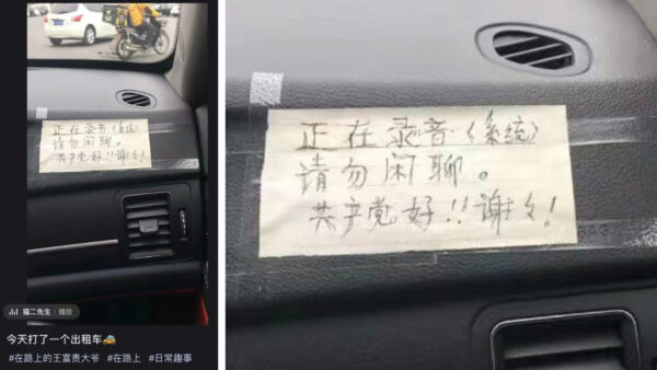 北京のタクシー内にあった貼り紙は「録音している。口を謹んで」。盗聴され、監視されていることを、運転手が乗客に知らせて注意喚起しているのだ。