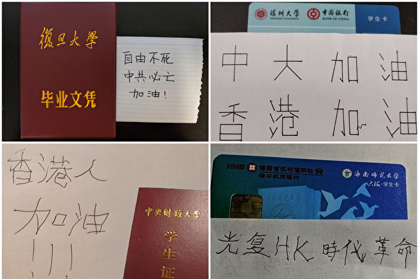 中国本土の大学生らは13日、今週香港警察に厳しく取り締まれた香港中文大学と城市大学の学生のために、ネット上で声援活動を発起した。数日内、500人以上のユーザーが学生証や卒業証書の写真を添えて支持のコメントを投稿した。