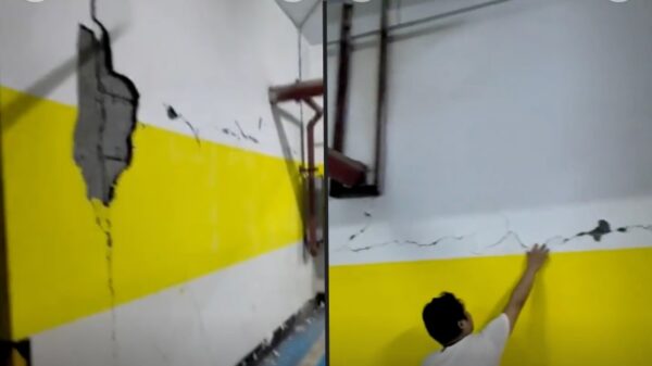 中国のある集合住宅の建物が突然大きな音を立て振動し、その後に建物の外壁やガレージの壁、住民宅内の壁などに深い亀裂が入った。