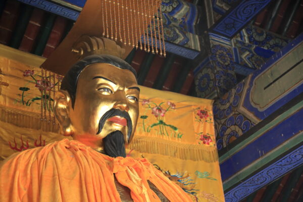 劉備と張飛との出会いに続いて、ついに関羽の登場です。張飛の声は雷のごとく、勢いは奔馬のごとくというものでしたが、関羽の相貌は神将のごとく、一身に神威を帯びており、一見しただけで人々に畏敬の念を覚えさせるものでした。関羽は身の丈9尺(後漢の尺度では約208cm)、髭の長さは2尺(同じく約46cm)、熟した棗(ナツメ)の様な紅顔、唇は朱を塗ったよう、切れ長の目、太く逞しい眉を持ち、その風貌は堂々たるもので、威風は凛々たるものでした。