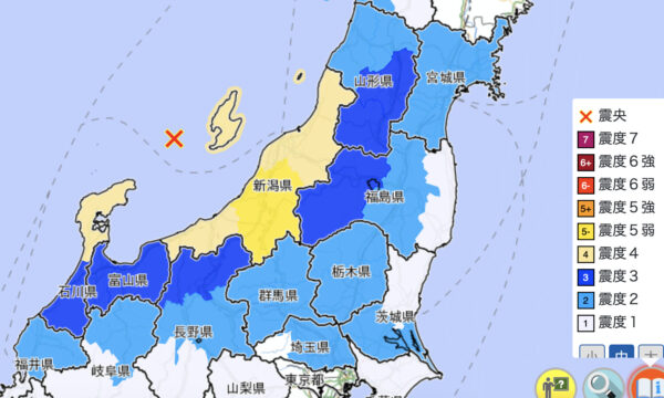 震度4:新潟県(三条市、柏崎市、見附市、魚沼市、上越市、新潟中央区、新潟秋葉区、新潟南区、新潟西区、新潟西蒲区、阿賀町、佐渡市)、石川県(七尾市、輪島市、珠洲市、中能登町、能登町)