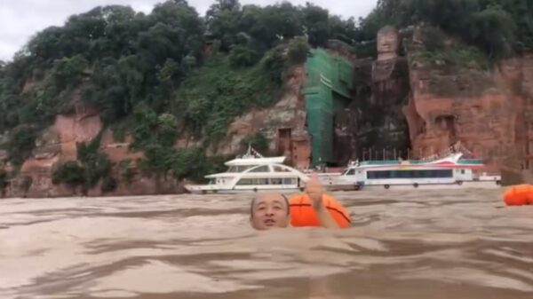 洪水により増水した世界遺産・「楽山大仏(四川省)」の足元の川で泳ぐ中年男女の集団。