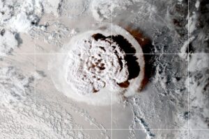 「1000年に1度」とも言われる南太平洋トンガの火山島の大規模噴火。15メートルの津波を引き起こし、1万キロ離れた日本の気象庁は「津波とは言えない」潮位変動に警告を発した。噴火当時は毎秒100本もの雷を計測したという。