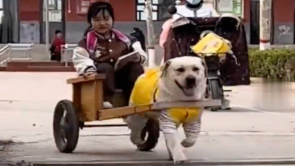 主人公は地元の幼稚園に通う女の子とそのペット犬(レトリバー)。ワンちゃんは自分仕様に改造された木製の「専用車」に小さなご主人様をのせて、自宅まで引っ張って運んだのだ。