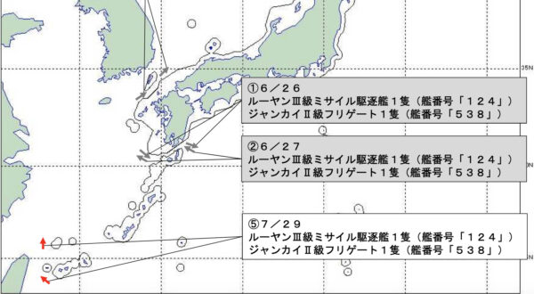 防衛省統合幕僚監部は、6月27日午後、宮崎県の都井岬南東約40kmの海域で、中国海軍のルーヤンⅢ級ミサイル駆逐艦1隻とジャンカイⅡ級フリゲート1隻を確認したと発表した。これらの艦艇は前日にも大隅海峡を通過しており、海上自衛隊が警戒監視活動を強化している。