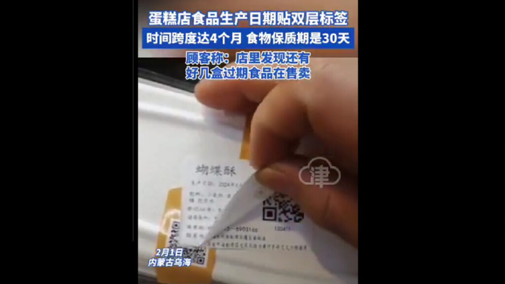 今月1日、内モンゴルのあるケーキ店の商品に「製造日」のシールが2重に貼られていることを示す動画が、ネットに流出した。