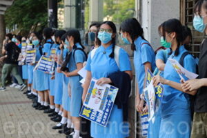 香港の屯門区にある4の中学校の生徒は5日朝、共同で「人間の鎖」を作り、警察当局が3日中高生を逮捕したことを抗議した。同時に、生徒らはこの活動を通して、政府に5大要求に応じる求めた。
