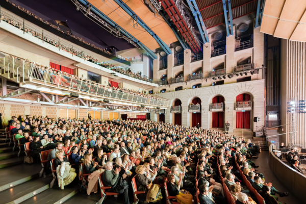 幕が上がると、壮麗な天界の光景が舞台に広がり、客席からは熱烈な拍手が巻き起こった。舞踊家たちの卓越した技術に観客は息をのむほど魅了され、特に高度な技を披露するたびに称賛と拍手が沸き起こった。また、司会者が生演奏の楽団を紹介すると、観客は雷鳴のような拍手で芸術家たちを称えた。公演終了後も拍手が鳴り止まず、神韻のアーティストたちは二度にわたりカーテンコールに応え、アンコーナの観客の熱い声援に感謝を示した。