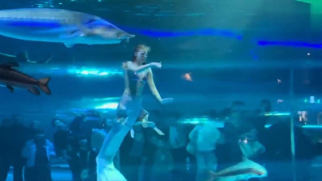 巨大水槽のなかを優雅に泳いでいた「マーメイド役の人」が近くを泳いでいた巨大魚に頭を丸ごと飲み込まれたのだ。