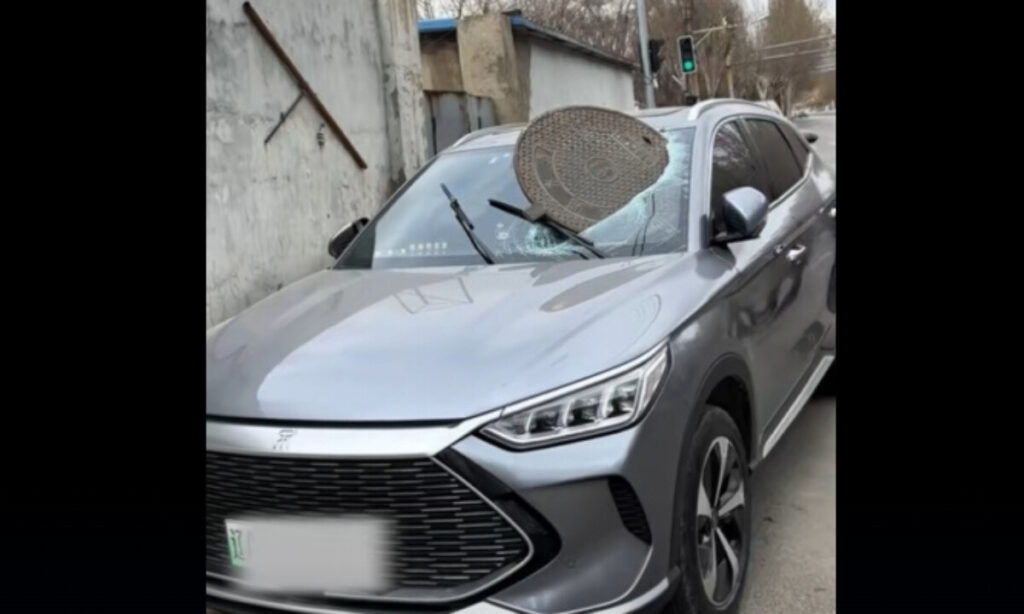 3月27日午前、中国遼寧省瀋陽市で走行中の車が突然、飛来したマンホール蓋の直撃を喰らった。