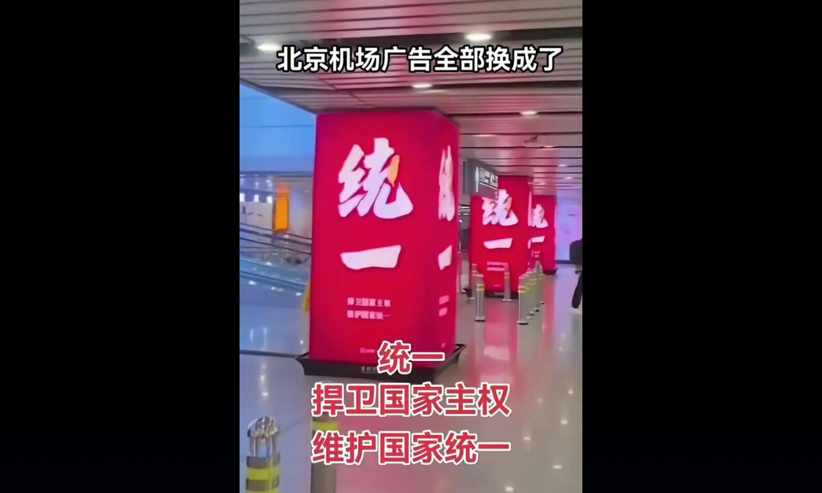 北京空港の柱にずらりと「統一」の文字広告 威勢はいいが中身は