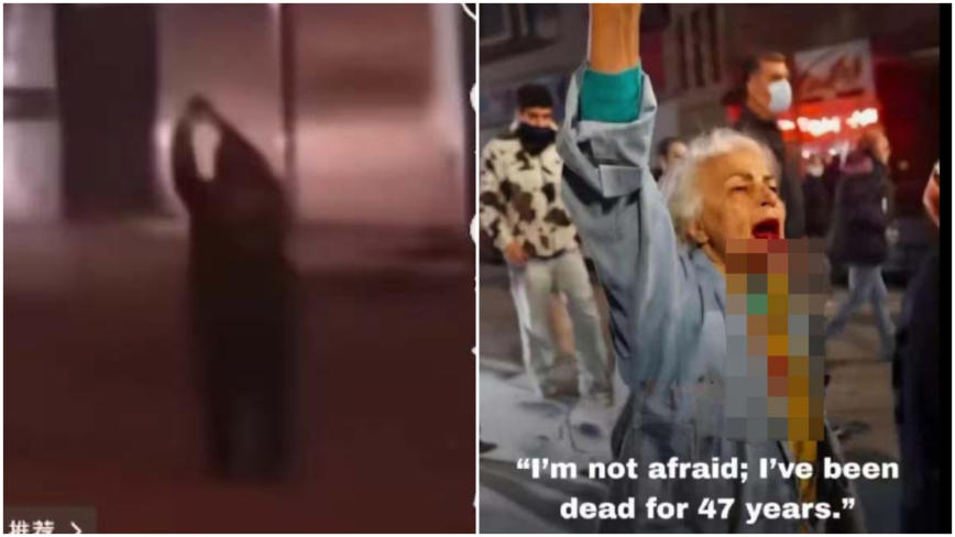 (口元から血を流しながら拳を掲げ、「私は怖くない。私はもう47年前に死んでいる」と叫ぶ高齢の女性。2026年1月、イランの街頭)