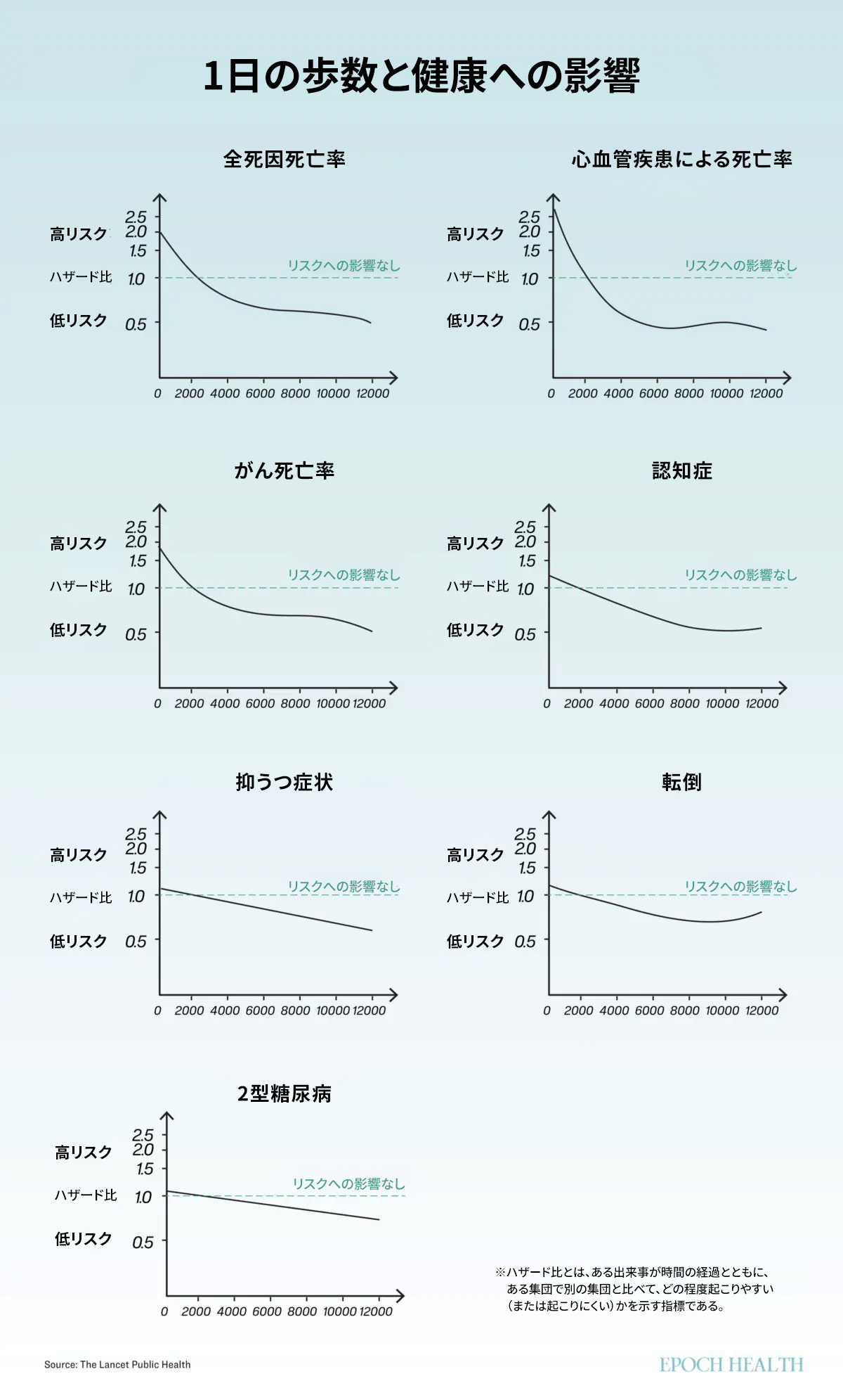 毎日の歩数は、がん、認知症、心血管疾患など、さまざまな健康問題のリスク低減と関連しています。『The Lancet Public Health』に掲載された最近の研究では、疾患リスクの全体的な低下は1日5,000~7,000歩で最も大きく、それ以上では効果が次第に小さくなることが示されました。
